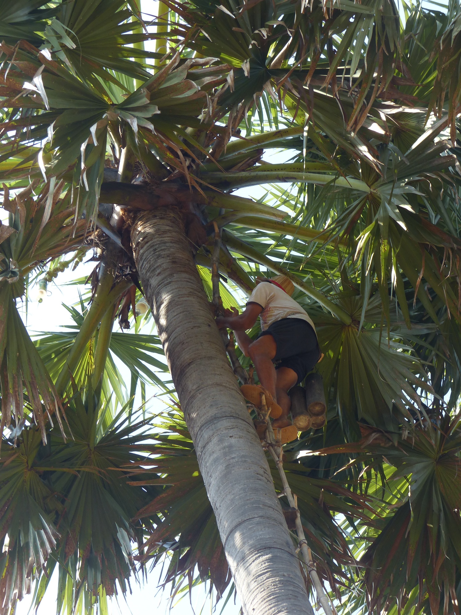 Le palmier à sucre est l’arbre emblématique du Cambodge. On tire parti de tout l’arbre, de la sève au fruit, de la feuille au tronc, utilisé pour la construction de petites barques taillées à même le tronc.