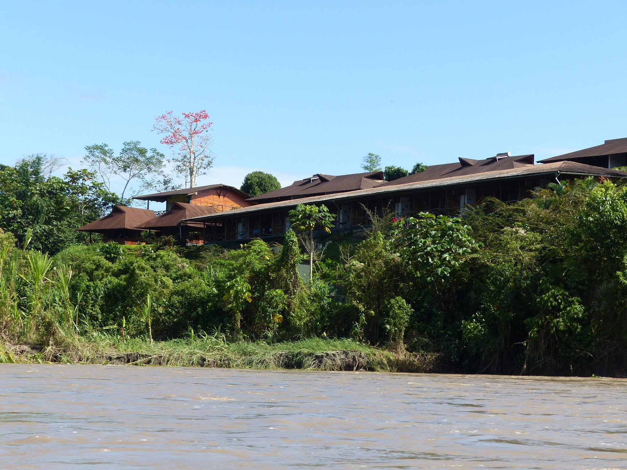 Après une longue route, embarquement dans une pirogue, et découverte du fleuve Napa. Nous arrivons au lodge !!! Superbe, en bord du fleuve !!!! Un peu sur les hauteurs !!!! Ce rêve d'Amazonie devient enfin réalité ! De la verdure partout, des plantes, des arbres, des oiseaux, de la brume, du vent .... et les pirogues qui passent sur l'eau à longueur de journée .... l'ambiance y est !!!!!!