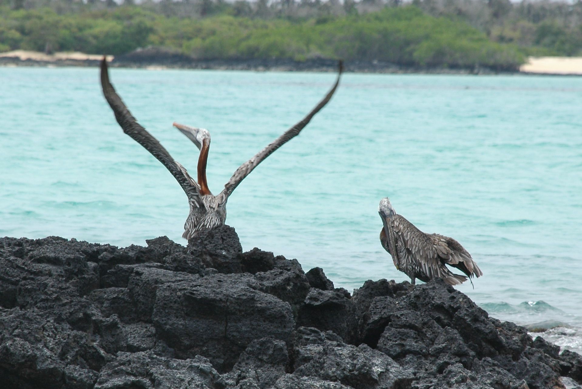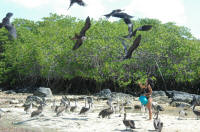 Le lendemain du réveillons, nous décidons de faire un saut dans le canyon Los Greta. Un bateau taxi nous amène de l'autre côté du port et nous atteignons une petite plage au pied d'un hôtel. La une jeune fille nourrit les pélicans et les frégates et ici aussi la bataille fait rage pour obtenir le précieux sésame. Elle se fait carrément attaquer !