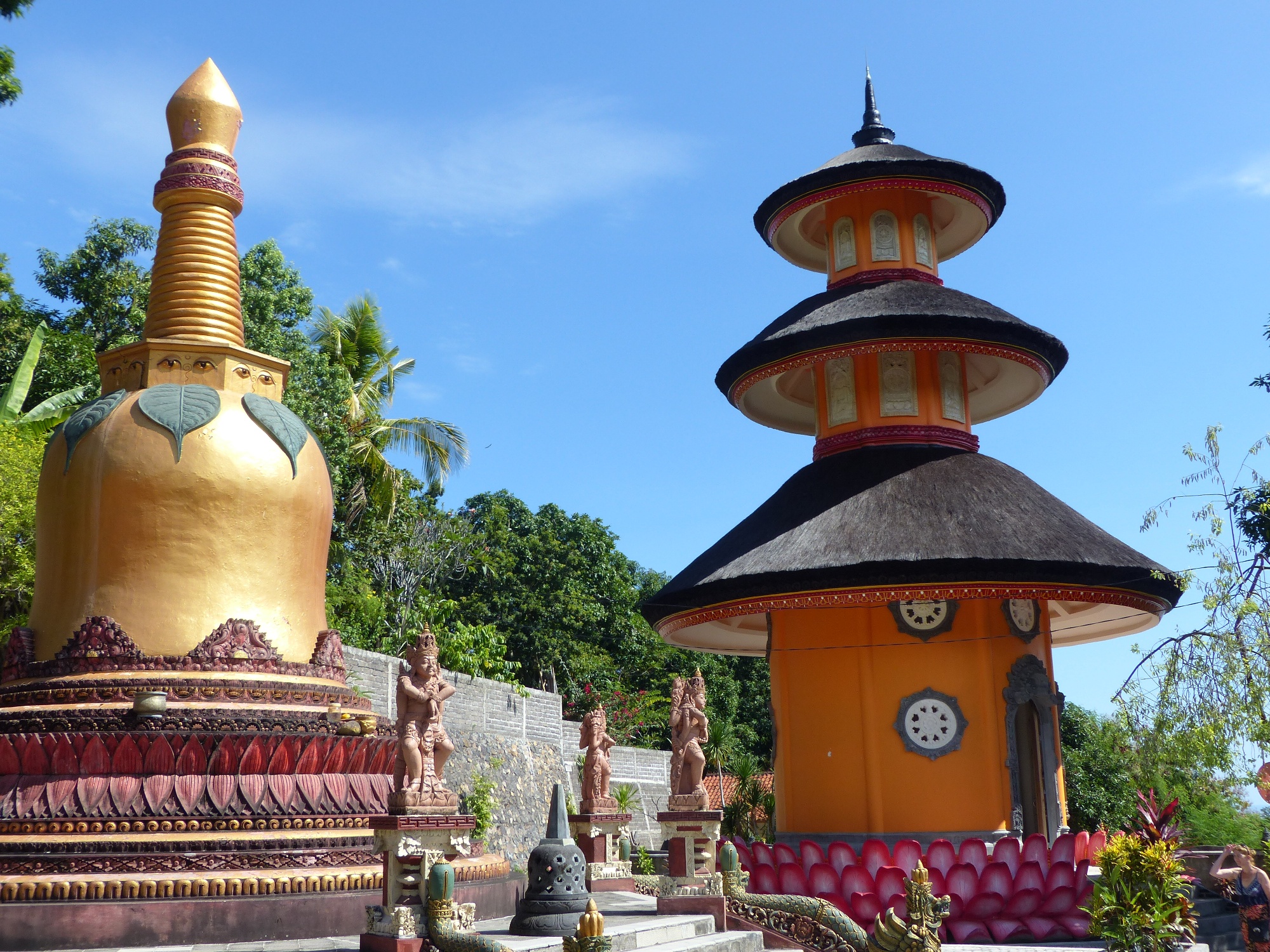 Voici ici le temple de Banjar, seul monastère bouddhique de Bali. Il est tout neuf ... et ... un peu bizarre je trouve ... quoique les stupas (colonnade à toit de chaume) sont superbes