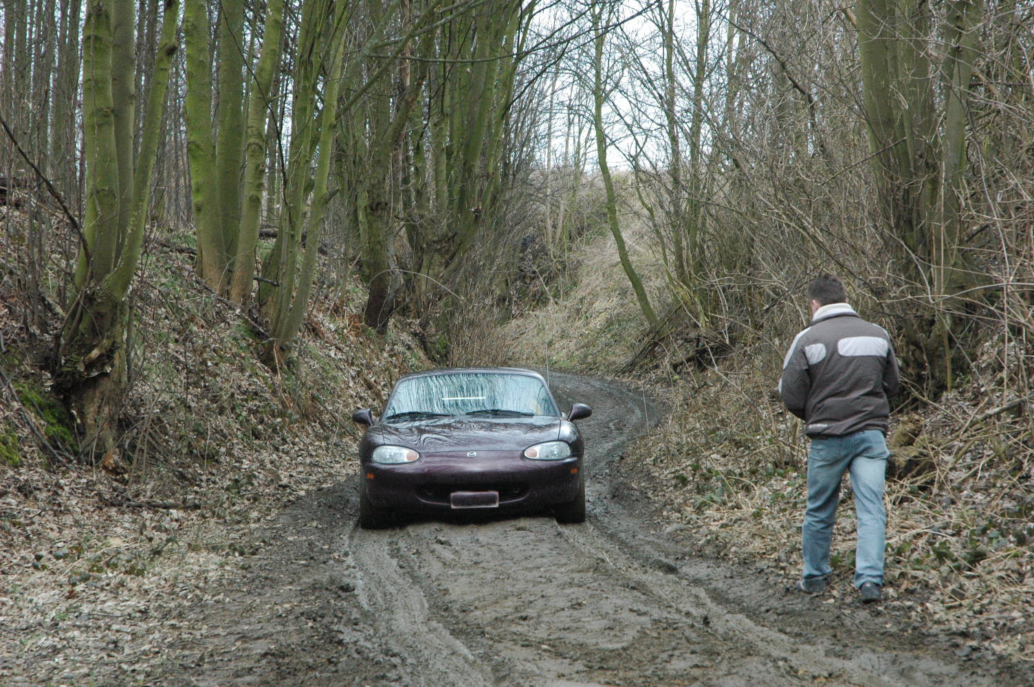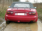 Grosse discussion .... le bitume est il encore loin devant ??? Pourra-t-on passer ??? Sommes nous assez nombreux pour pousser la voiture rouge ??? A ce moment, arrive une troisième miata .... qui s'arrête derrière moi, bien obligée !!! Impossible d'avancer ni de faire demi-tour...