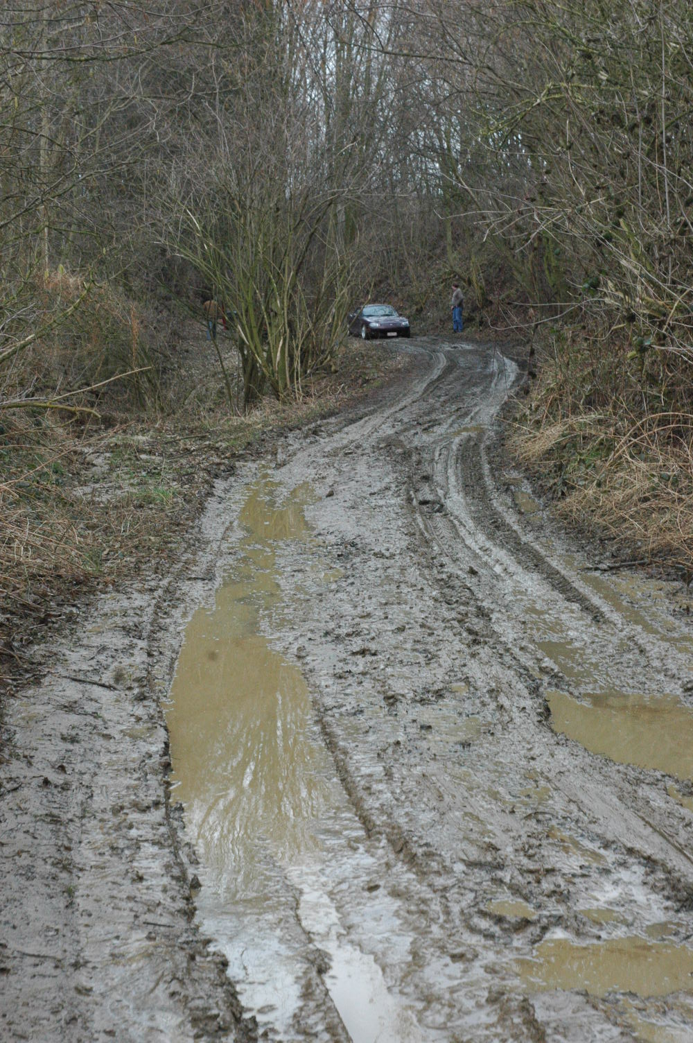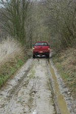 Ca descend maintenant assez dangereusement et ça gliiiiiiise ! et au détour du chemin .... la perspective d'aller plus loin ce fait nulle .... les ornières sont tellement grandes que je vois très bien que ma voiture surbaissée ne passera pas !!!!! Je m'arrête .. et au loin que vois-je ....