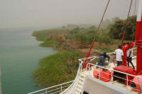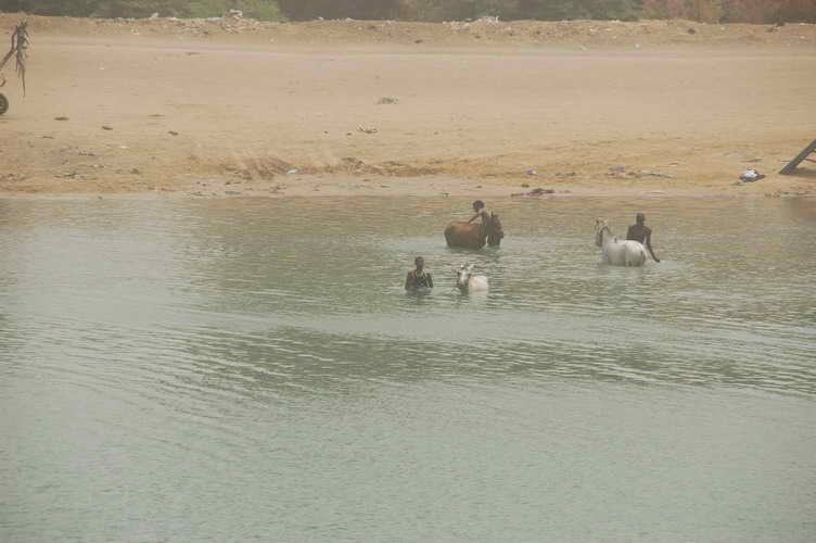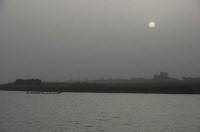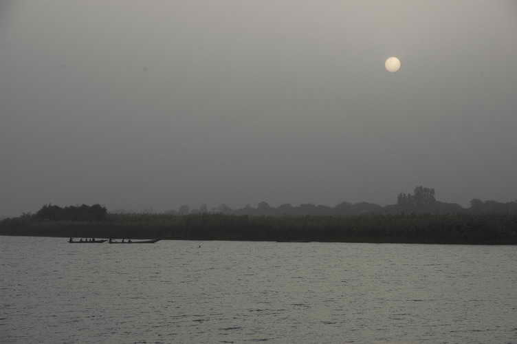 Le jour se lève !!!! oui, oui !!!! Mince on ne voit pas à 1km à la ronde !!! Le vent de sable s'est levé .... nous distinguons à peine la berge. C'est presque comme la purée de poids belge !!!