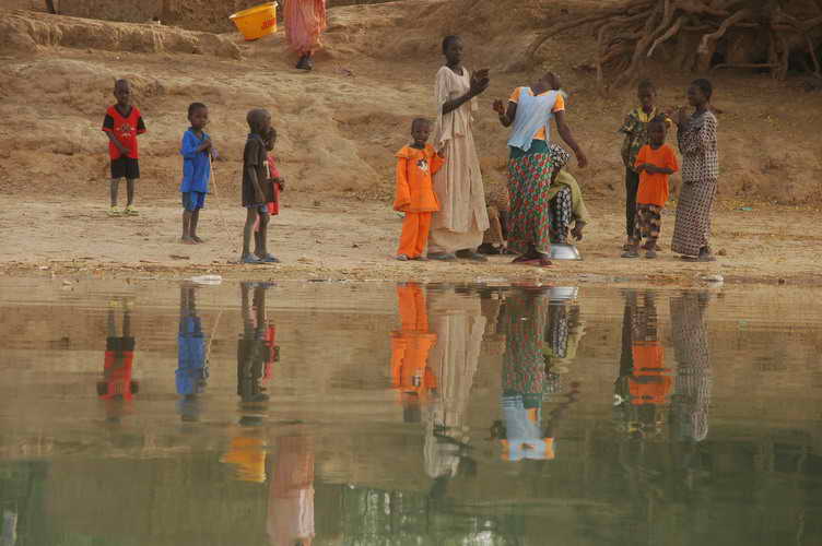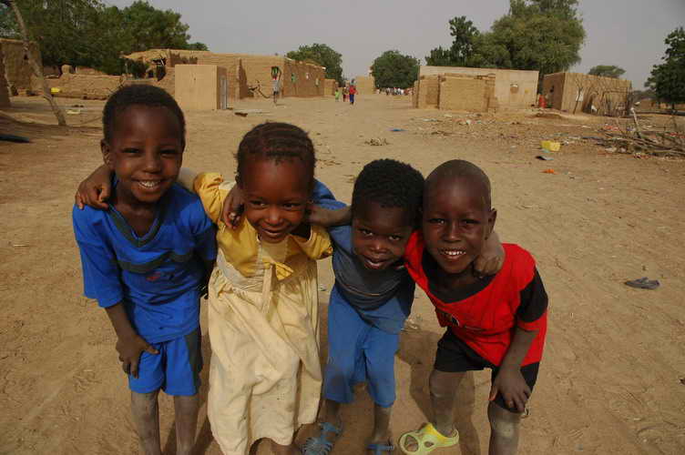 Nous entamons notre promenade près du fleuve, tranquilles, accompagnés des enfants du village