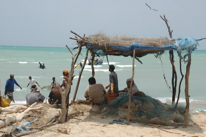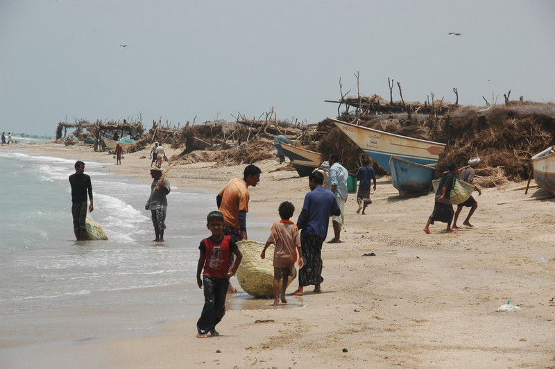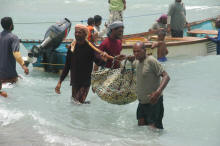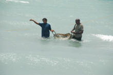 Et voici les pêcheurs ... les hommes vident les bateaux avec de grandes nasses tressées