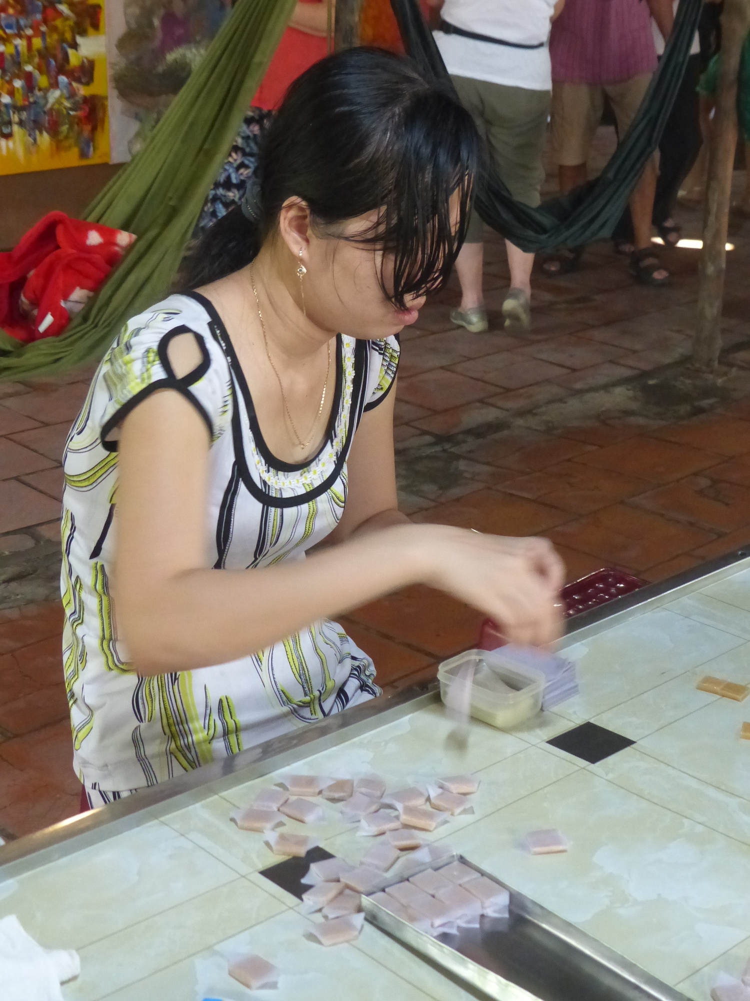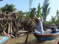 Après la pagode, une petit promenade entre les iles de My Tho en barque .... il y a foule et les femmes qui nous conduisent restent accroupies ainsi toute la journée ....