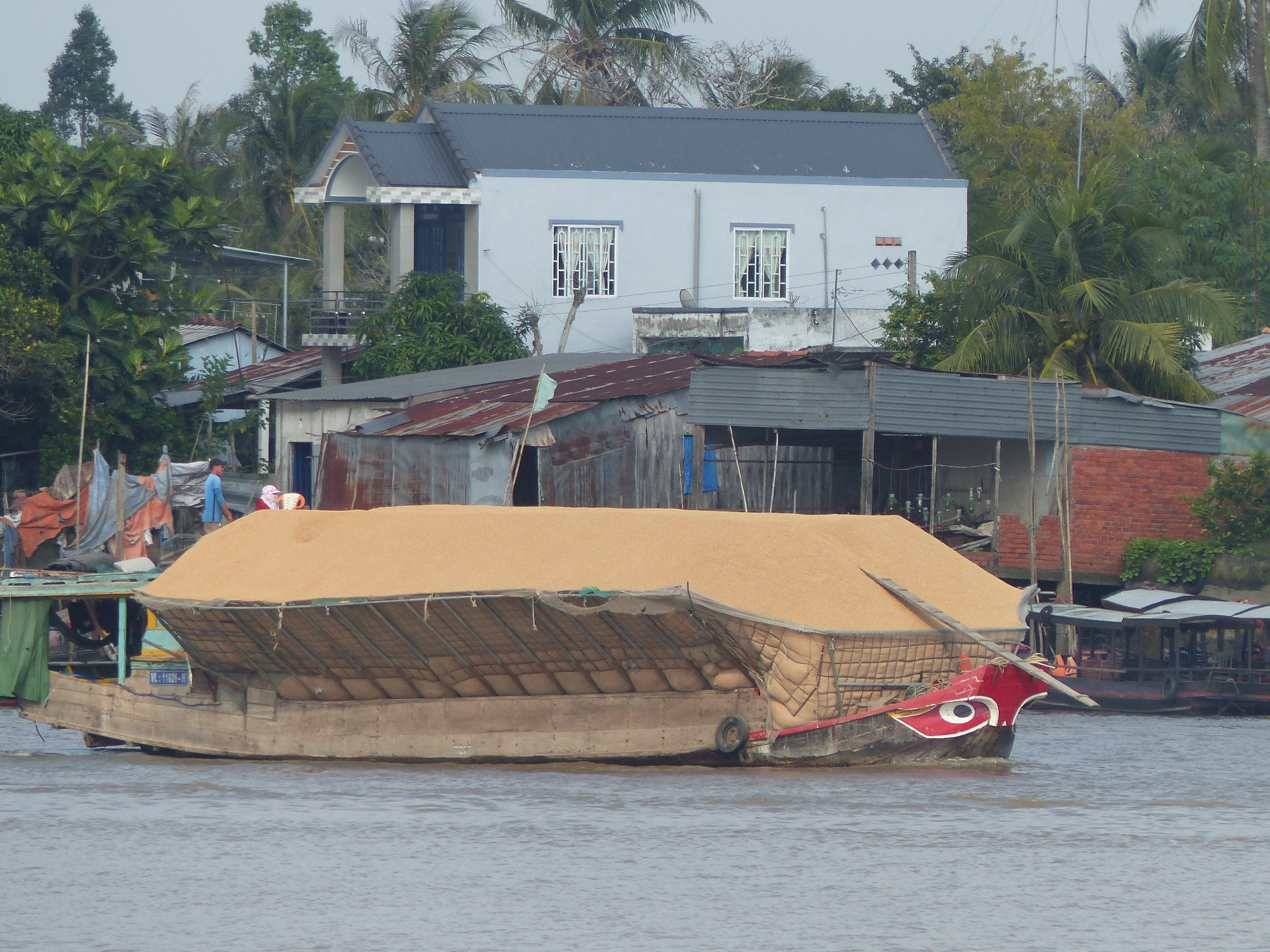 Voici un bateau important .... et nous le verrons tout au long de notre voyage. Il s'agit de transport d'écorces de riz. Ca sert de combustible dans de multiples cas. J'en reparlerai plus loin