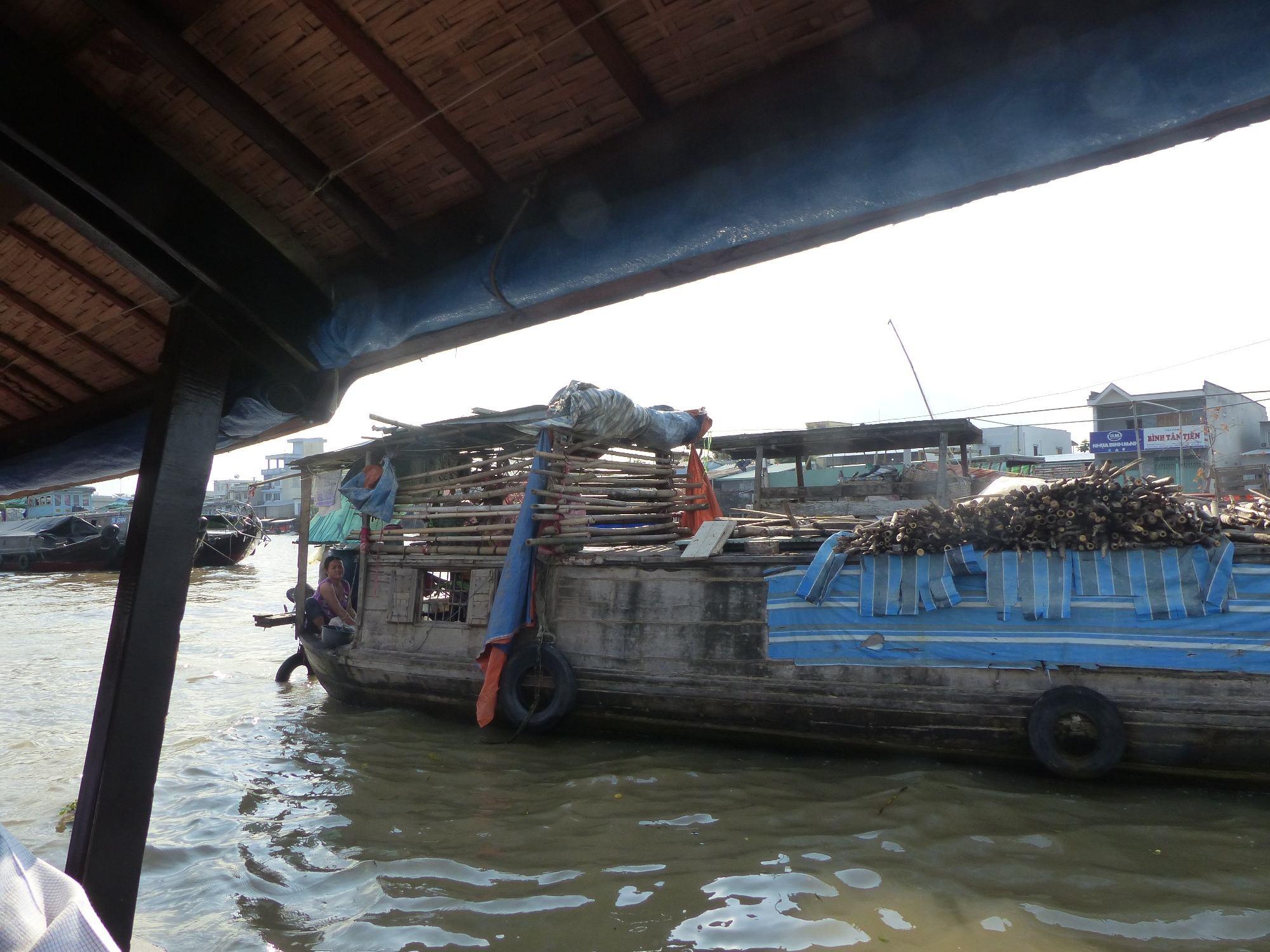 Ici nous arrivons au marché flottant, et une perche au dessus du bateau indique les ingrédients qui s'achètent sur ce bateau