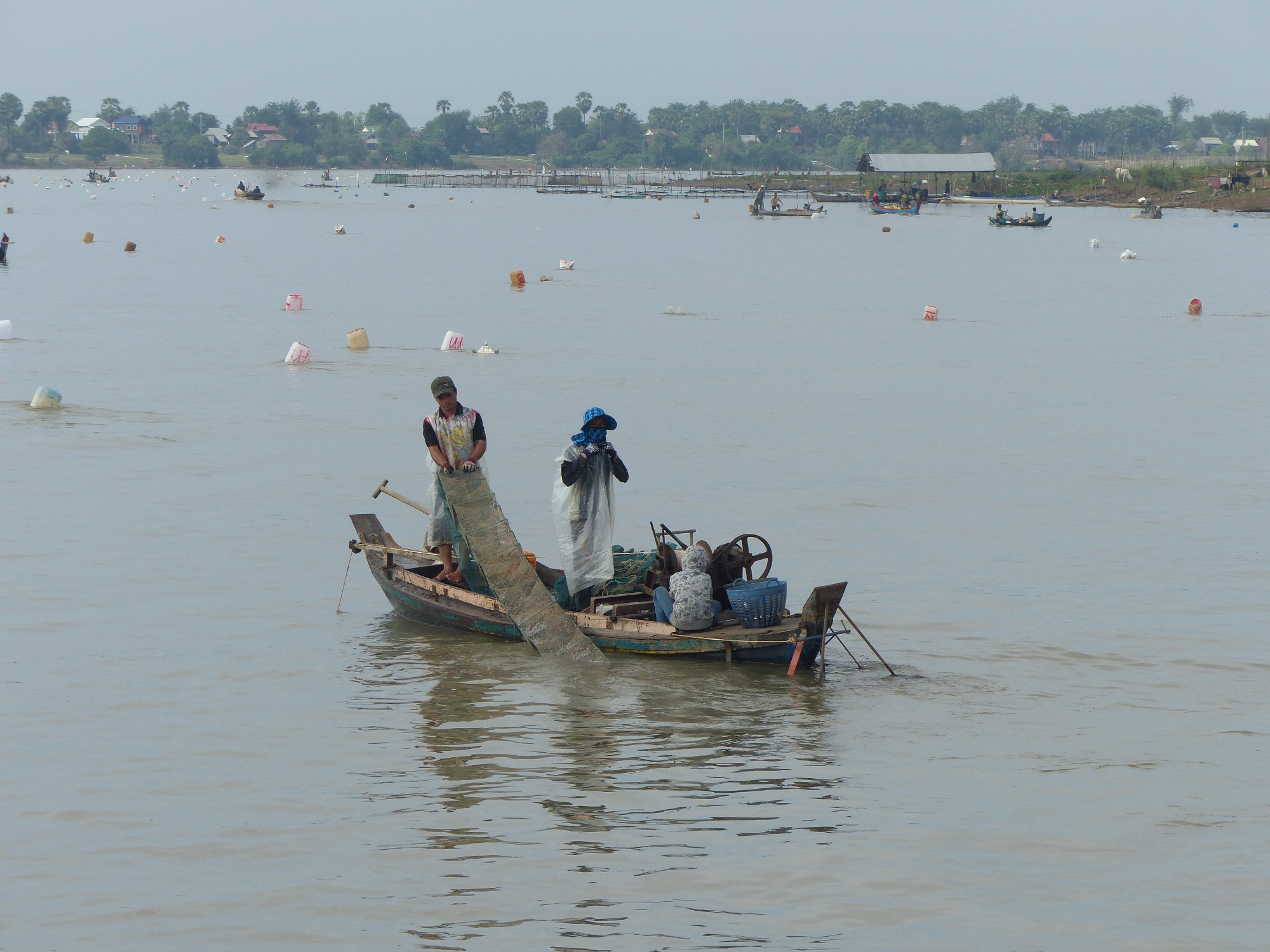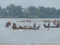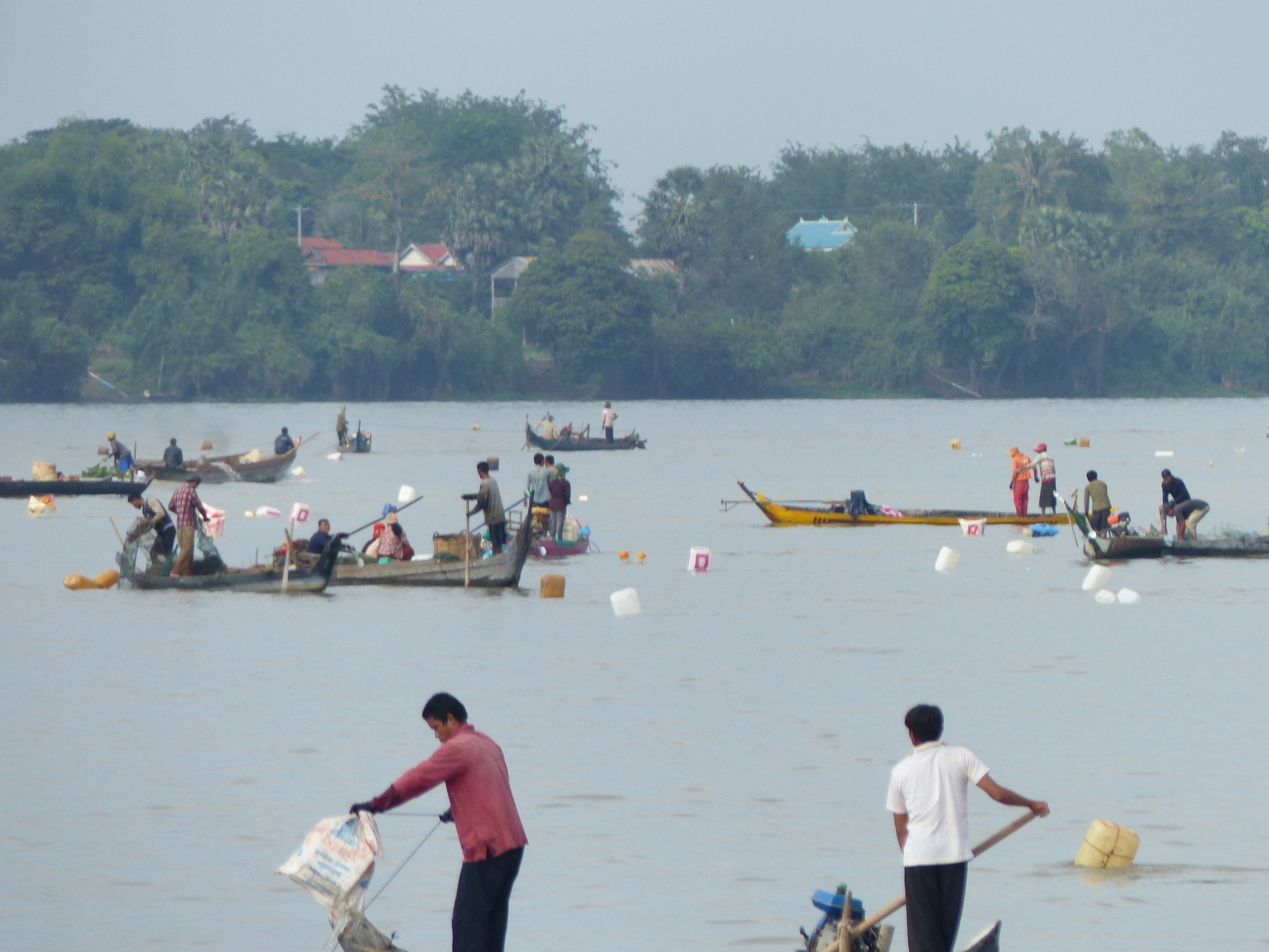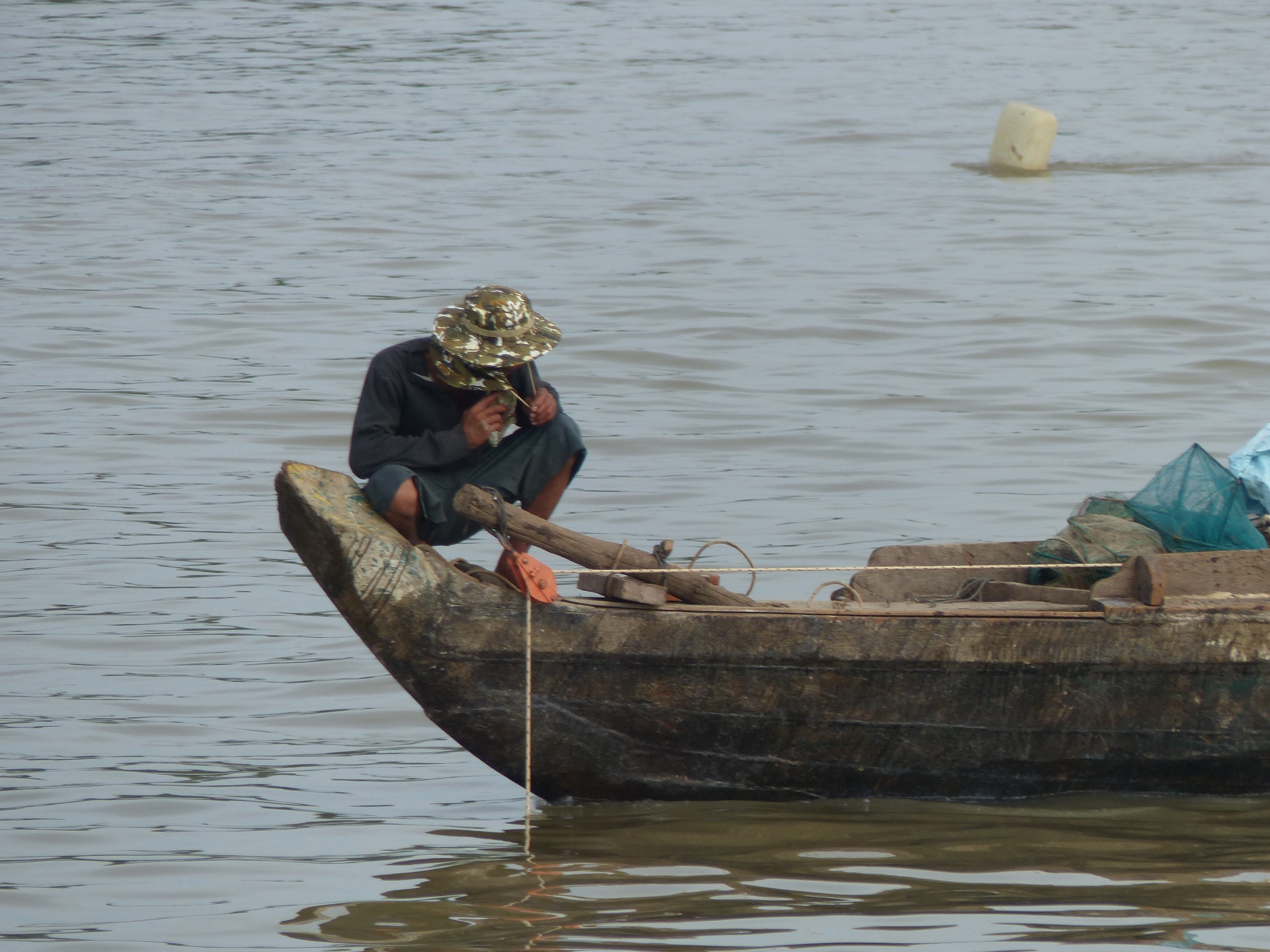 Durant la navigation, tout à coup nous voyons beaucoup de pécheurs, mais quand je dis beaucoup c'est vraiment beaucoup, des centaines de barques avec une, deux ou trois personnes à bord, voir plus parfois, des filets qu'on relève, des paniers qu'on tire, des bouteilles vides pour faire des flotteurs, bref un spectacle fabuleux ....