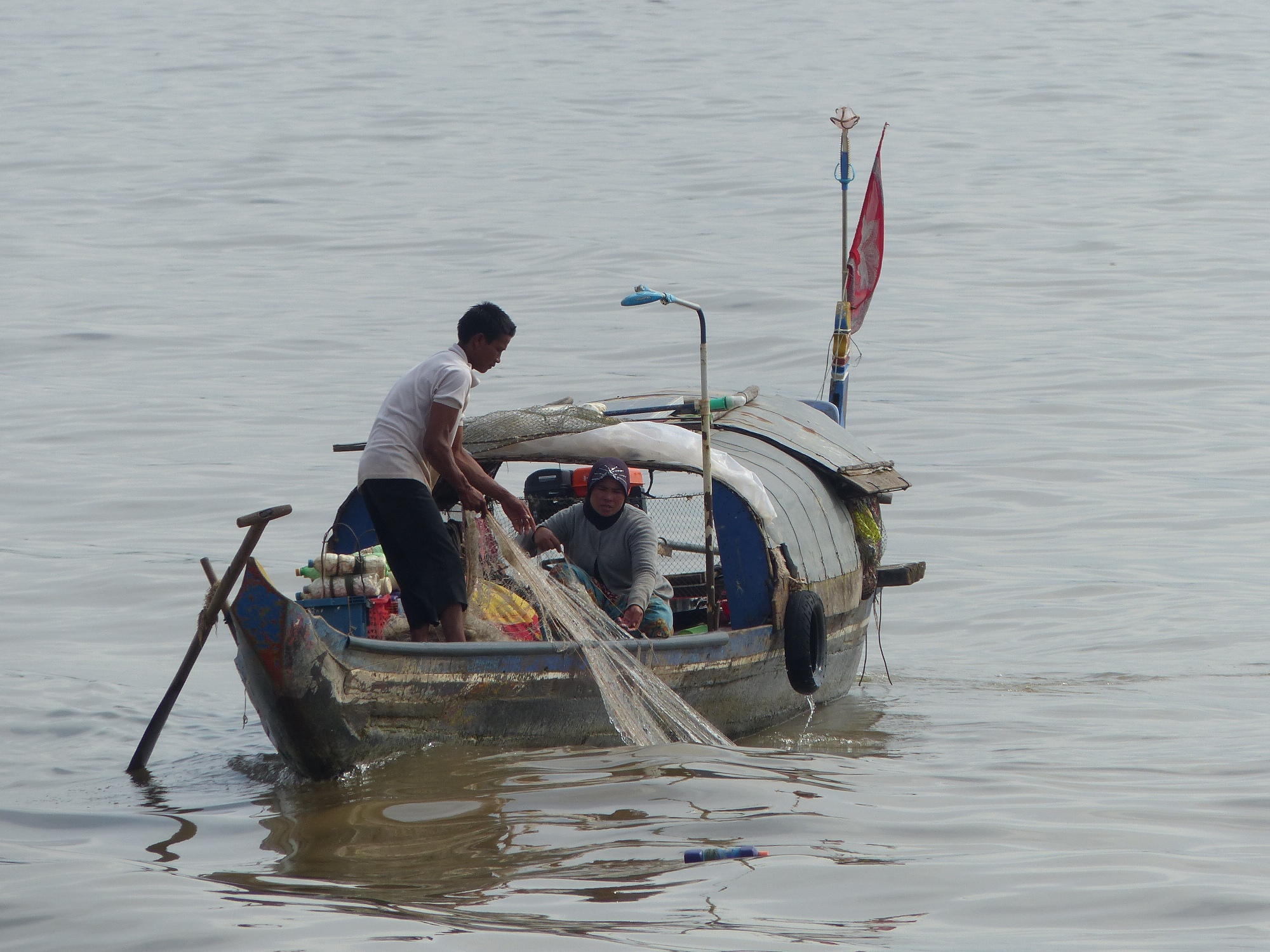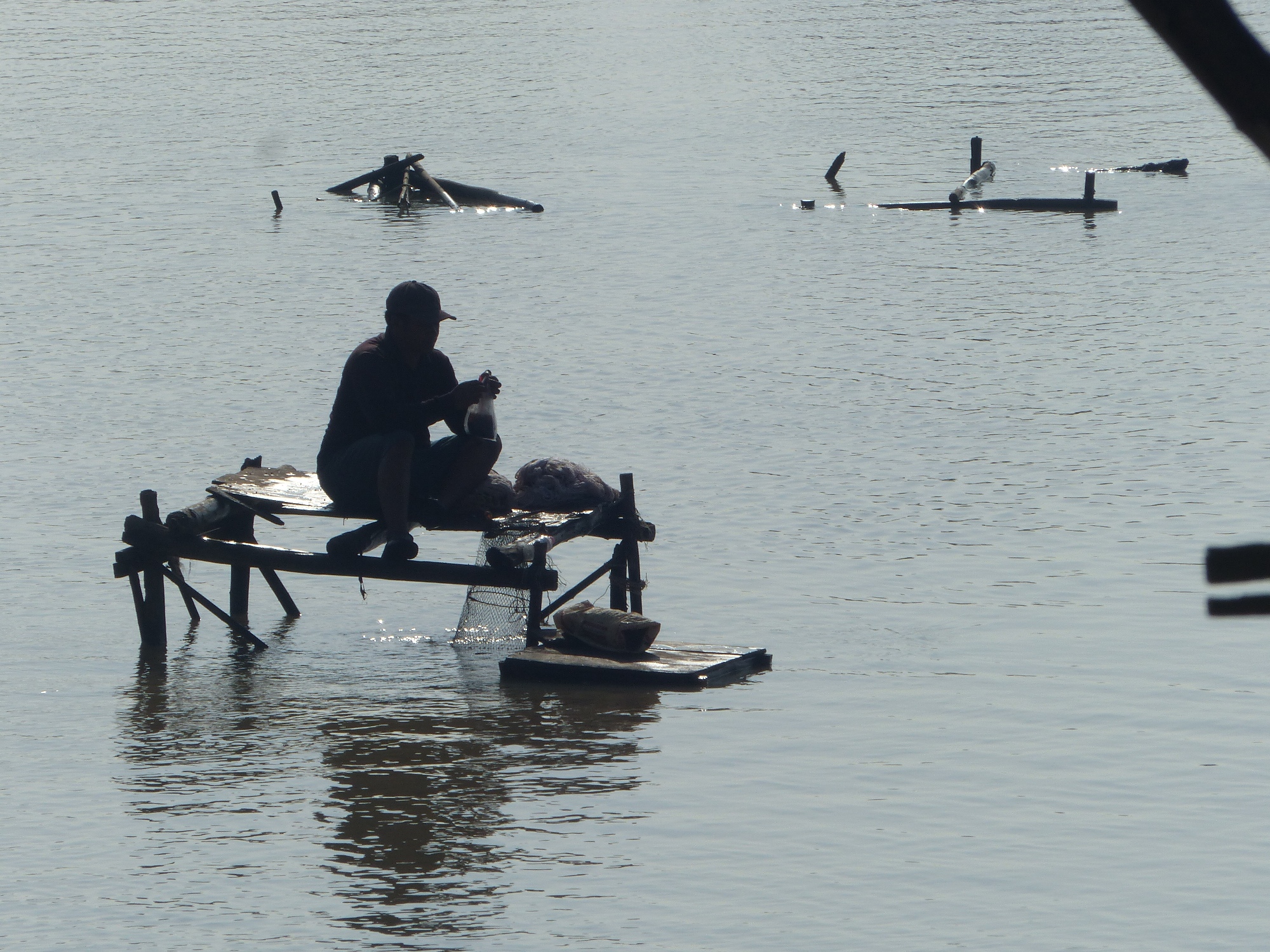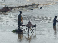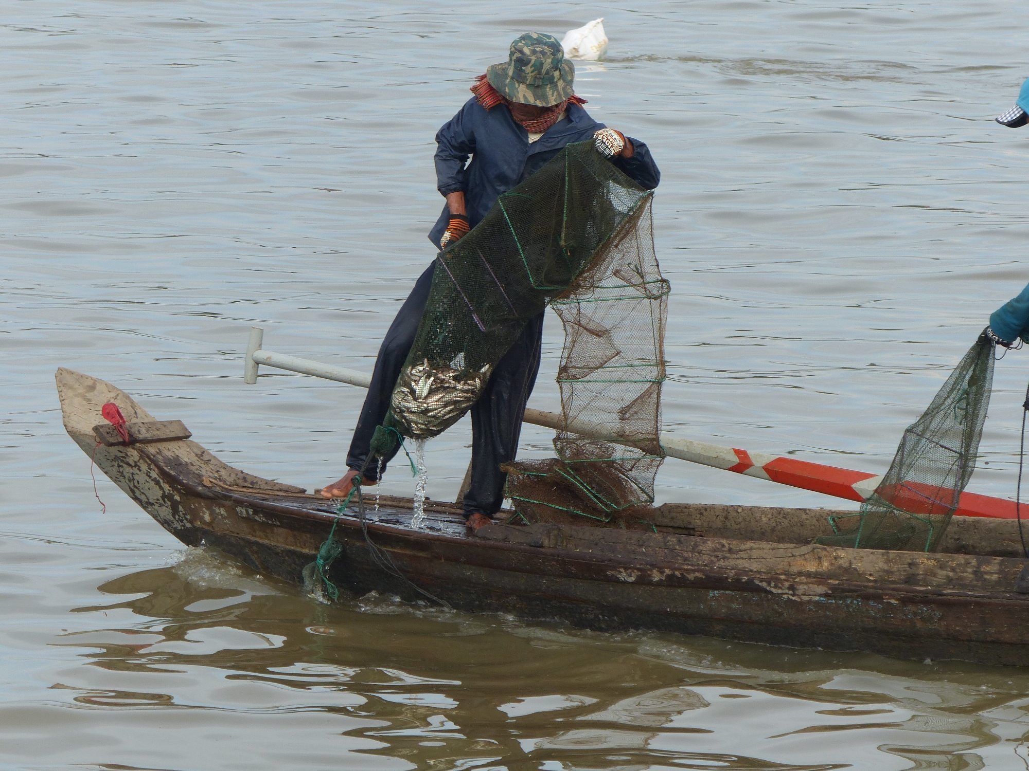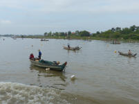 Durant la navigation, tout à coup nous voyons beaucoup de pécheurs, mais quand je dis beaucoup c'est vraiment beaucoup, des centaines de barques avec une, deux ou trois personnes à bord, voir plus parfois, des filets qu'on relève, des paniers qu'on tire, des bouteilles vides pour faire des flotteurs, bref un spectacle fabuleux ....