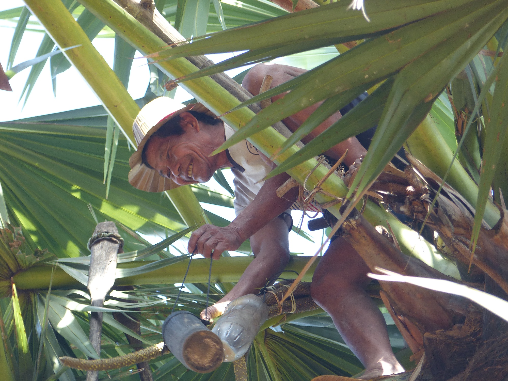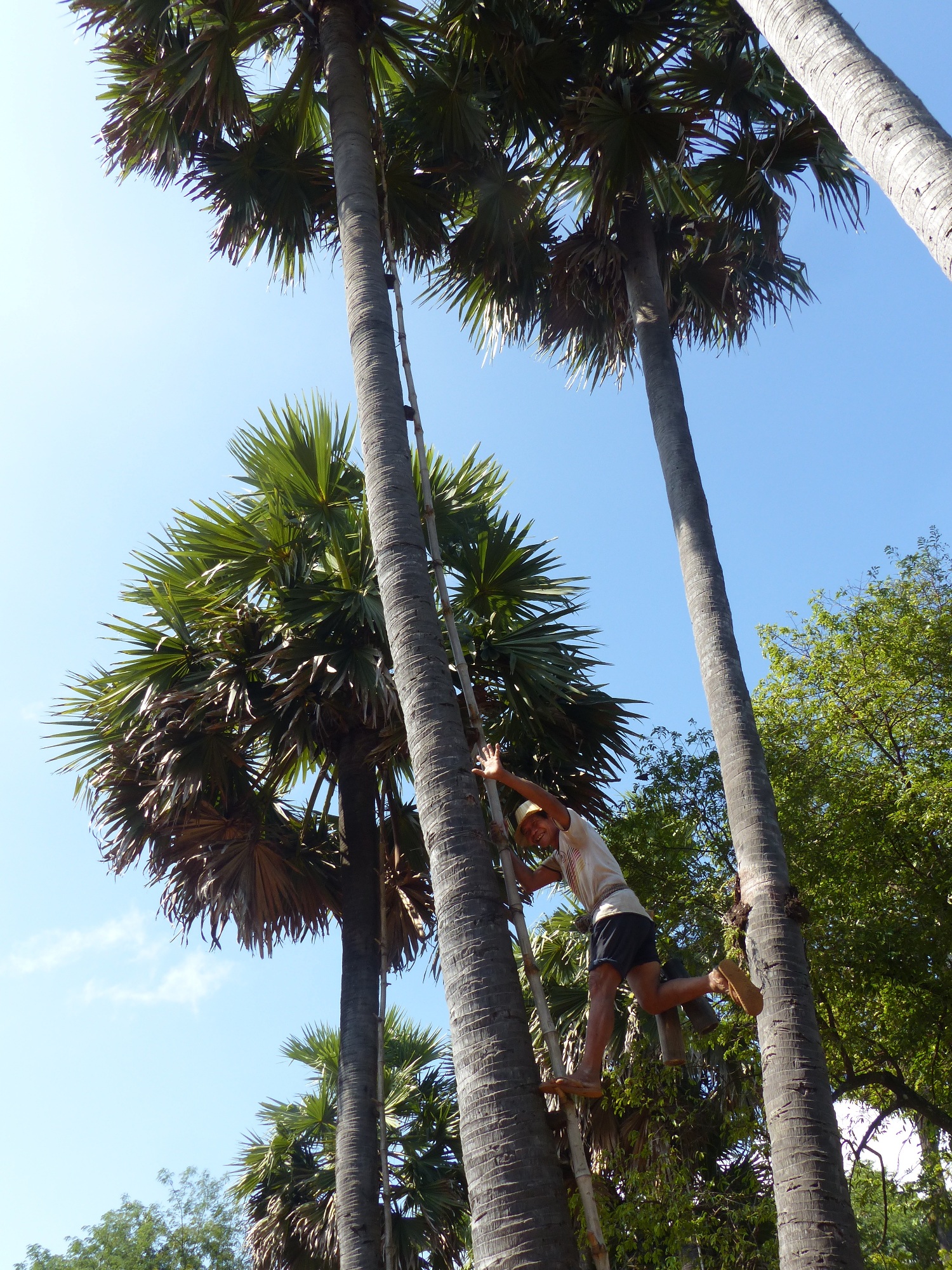 Le palmier à sucre est l’arbre emblématique du Cambodge. On tire parti de tout l’arbre, de la sève au fruit, de la feuille au tronc, utilisé pour la construction de petites barques taillées à même le tronc.