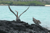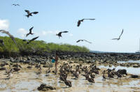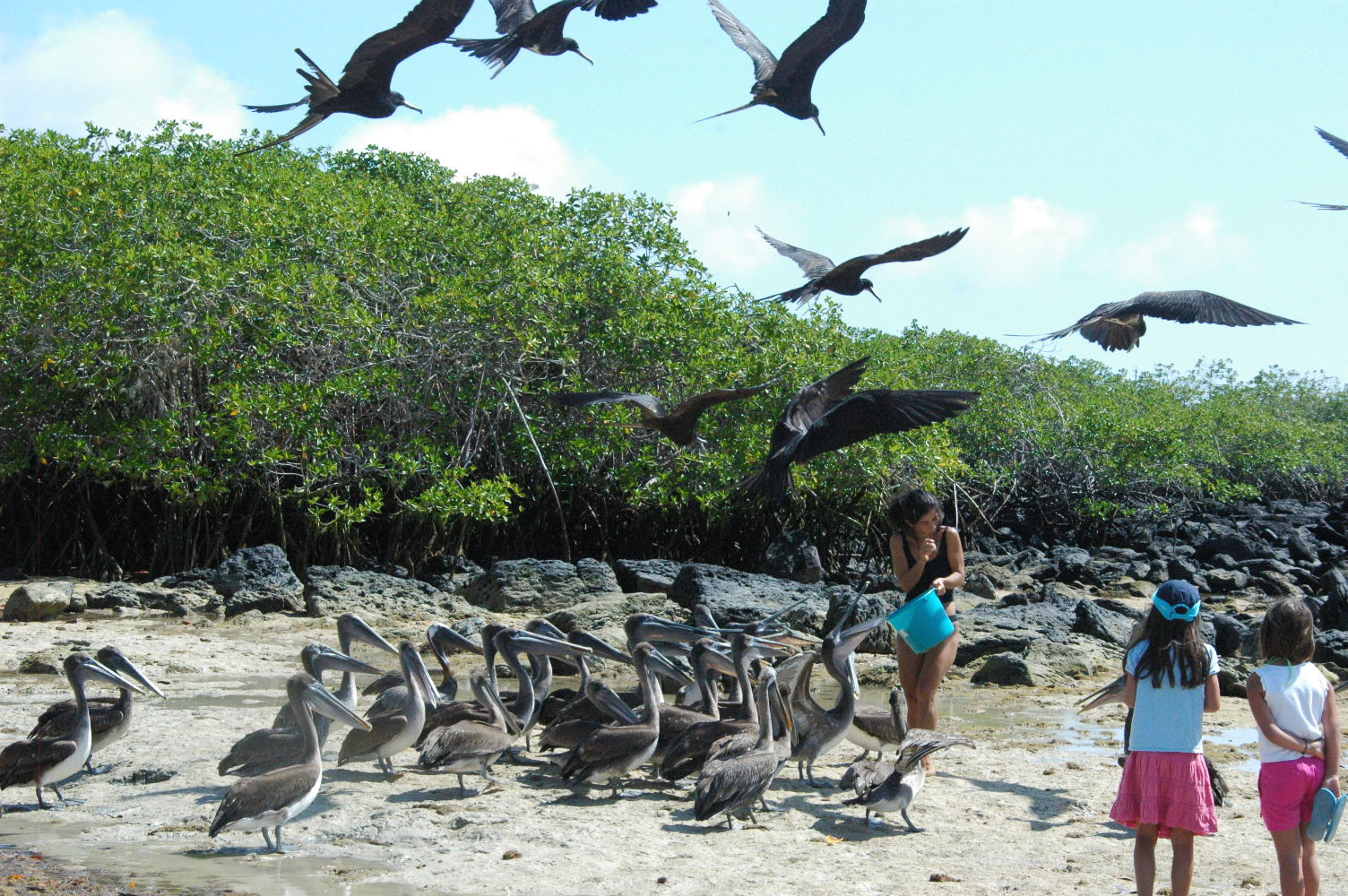 Le lendemain du réveillons, nous décidons de faire un saut dans le canyon Los Greta. Un bateau taxi nous amène de l'autre côté du port et nous atteignons une petite plage au pied d'un hôtel. La une jeune fille nourrit les pélicans et les frégates et ici aussi la bataille fait rage pour obtenir le précieux sésame. Elle se fait carrément attaquer !