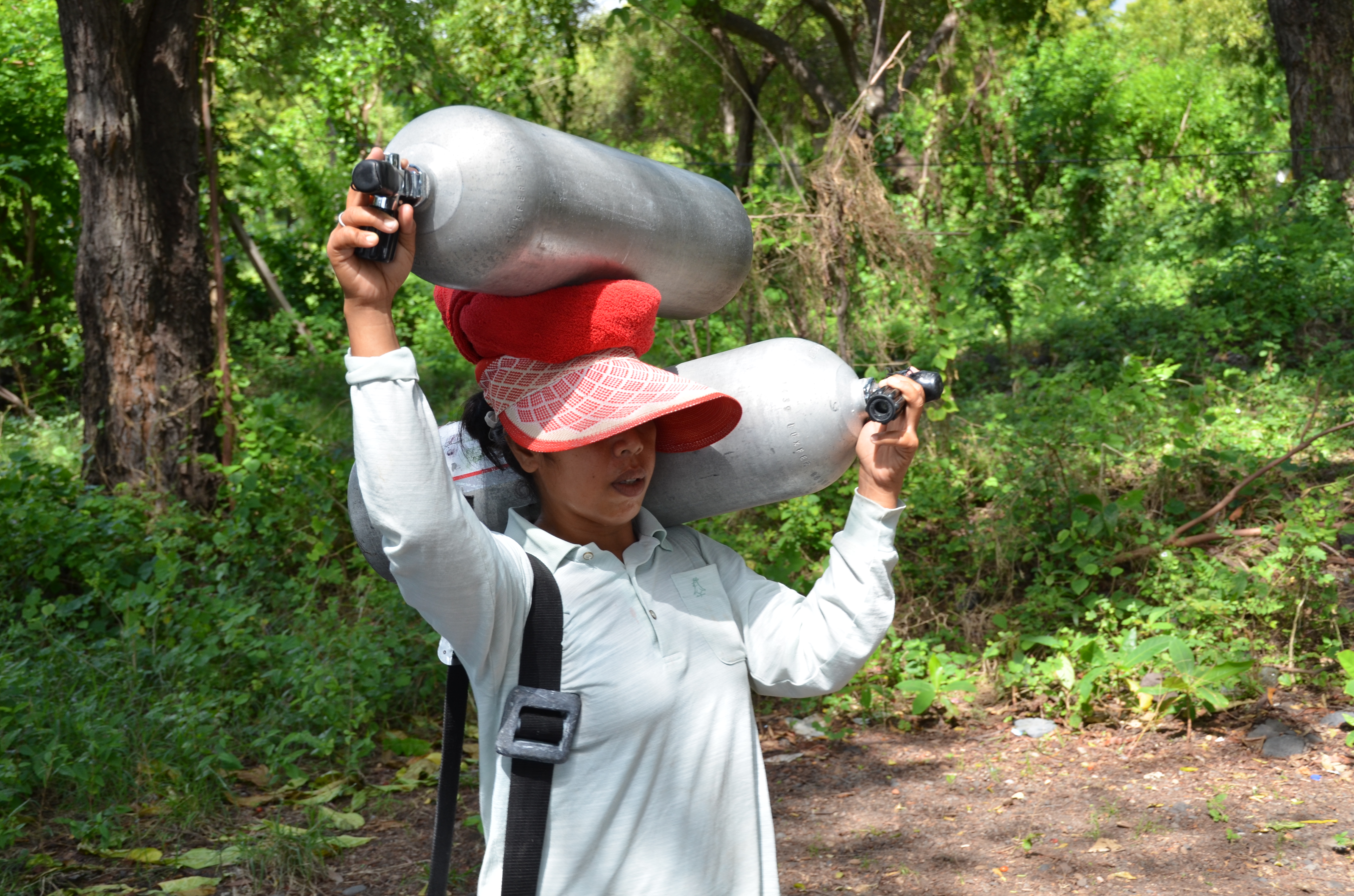 Avez vous déjà porté une bouteille de plongée ???? et bien c'est lourd, moi je vous le dis !!!!! Une bouteille varie entre 14 et 18 kg ...... alors deux ... plus le gilet ..... Il n'y a qu'un seul homme qui véhicule des bouteilles ... mais pas sur sa tête !!!!!!!
