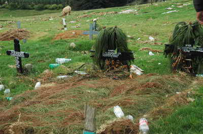 Le cimetière, très spécial, sans tombes réellement, quand on y marche on a presque l'impression de marcher sur les morts, à cause de ses tombes bombées, recouvertes d'une mousse verte, le sol s'y enfonçait en marchant ... impression assez désagréable. Détrompez vous, ces gens ne sont pas sales ... les rites veulent qu'on offre aux morts ce qu'ils aimaient... en boisson et nourriture... d'où les bouteilles jonchant le sol ...