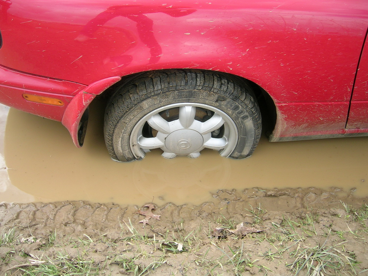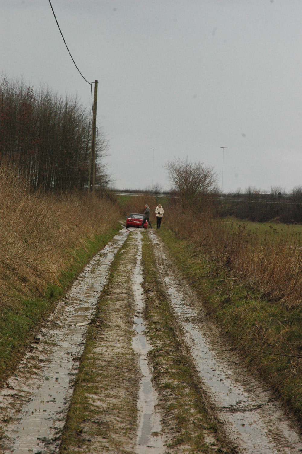La voiture rouge ... bloquée, embourbéeeee et les copains qui reviennent ... à pied !