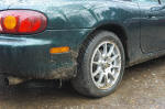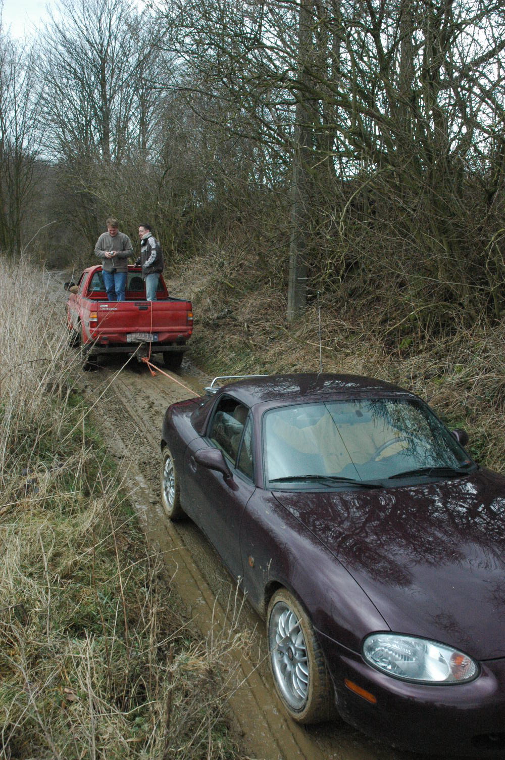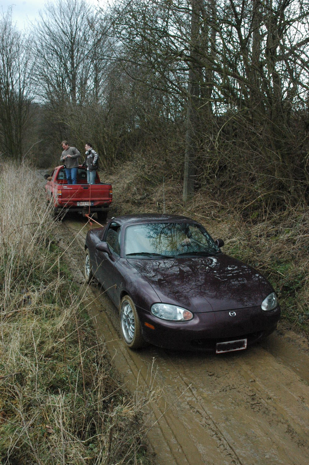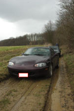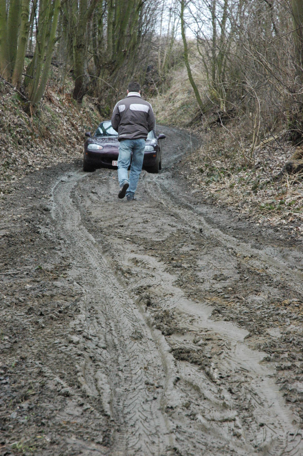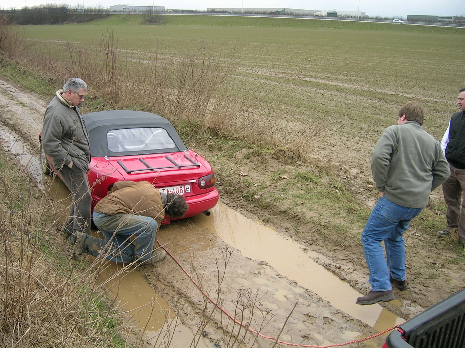 Grosse discussion .... le bitume est il encore loin devant ??? Pourra-t-on passer ??? Sommes nous assez nombreux pour pousser la voiture rouge ??? A ce moment, arrive une troisième miata .... qui s'arrête derrière moi, bien obligée !!! Impossible d'avancer ni de faire demi-tour...