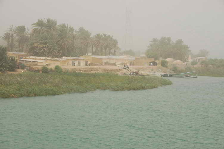 Le jour se lève !!!! oui, oui !!!! Mince on ne voit pas à 1km à la ronde !!! Le vent de sable s'est levé .... nous distinguons à peine la berge. C'est presque comme la purée de poids belge !!!