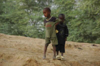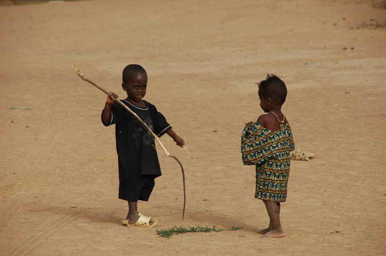 Nous entamons notre promenade près du fleuve, tranquilles, accompagnés des enfants du village