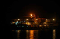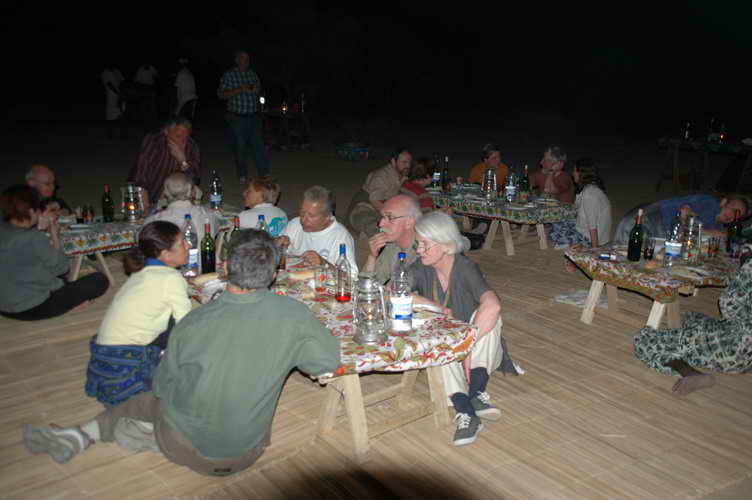 Et voilà notre surprise du soir ... un méchoui sur la berge ! Super !!! Nous sommes ravis !!! Le méchoui cuit à la broche depuis l'après midi, les tables dressées, nous nous croyons dans "Out of Africa", le bateau illuminé ....