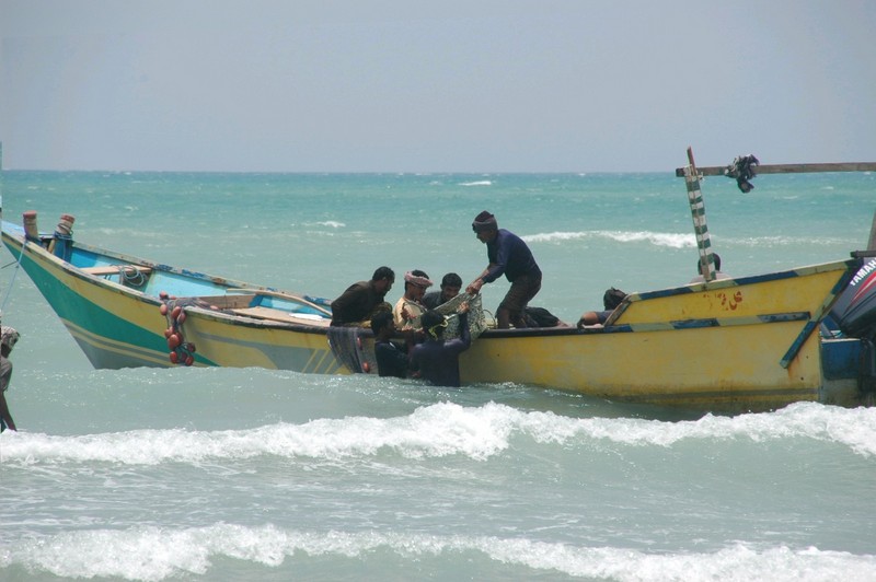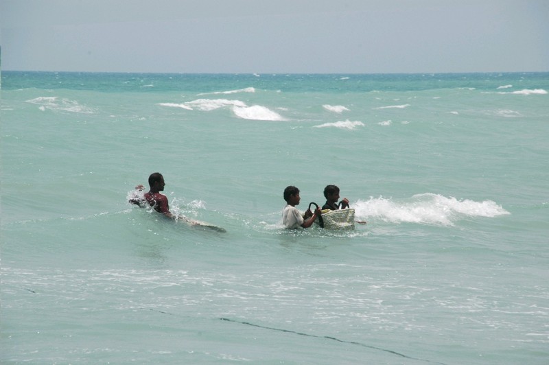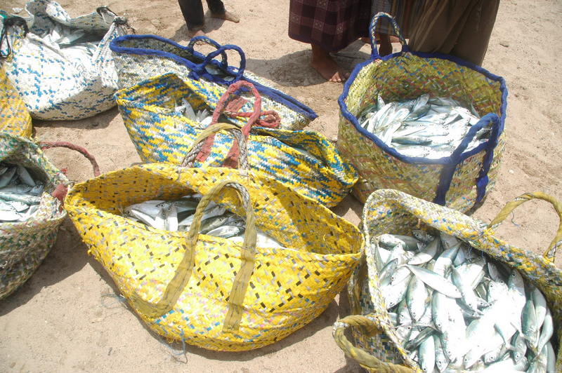 Et voici les pêcheurs ... les hommes vident les bateaux avec de grandes nasses tressées